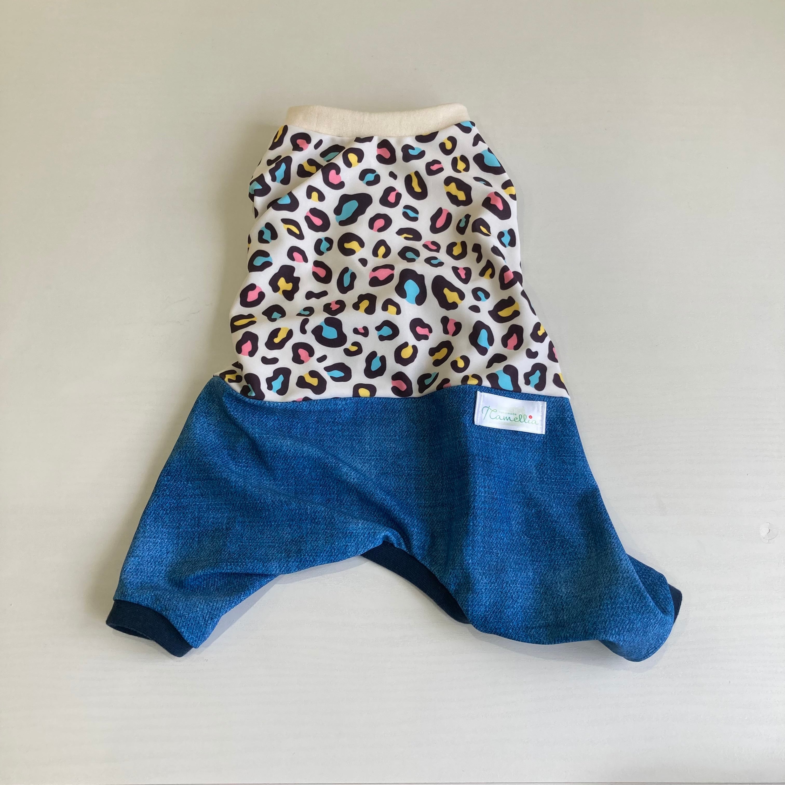 犬服 接触冷感 ロンパース レオパード柄(カラフル)&デニム Mサイズ オーダー 水着 レオタード