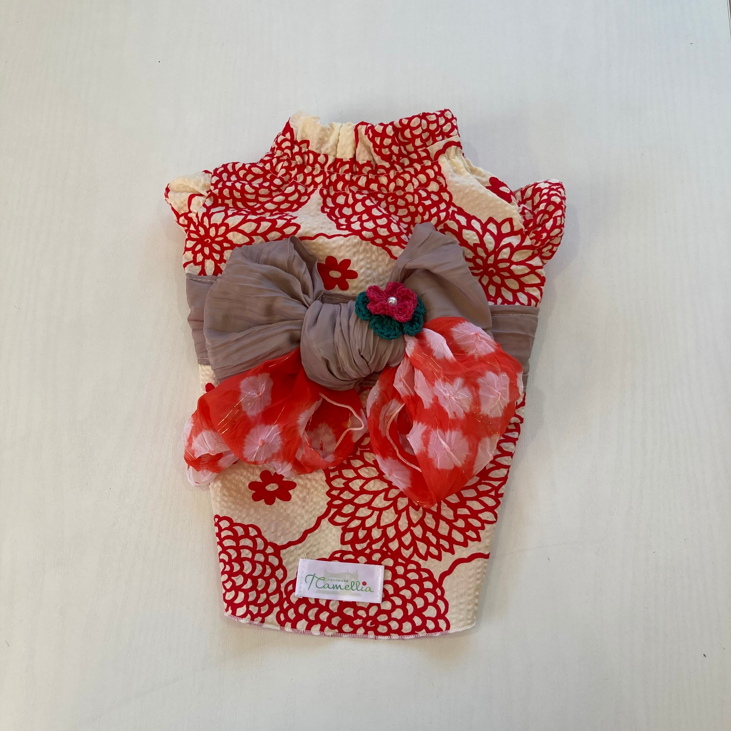 小型犬 首周りゴム入り 浴衣風タンクトップ 北欧風花柄(赤) Mサイズ お腹はひんやり接触冷感生地 お袖有り になります!