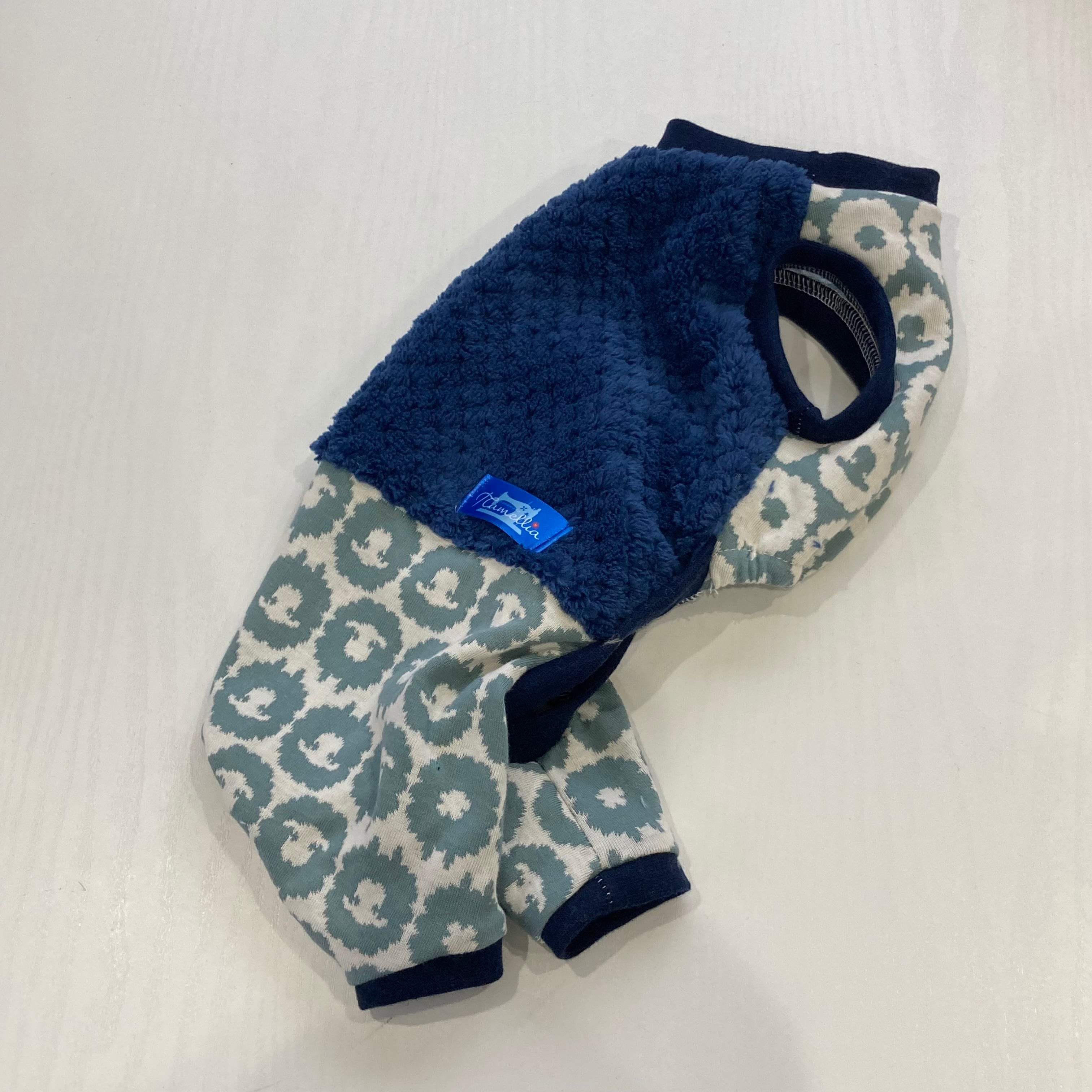 犬服 ボアツートンロンパース ひつじ柄&パイナップルボア紺(紺リブ) Sサイズ