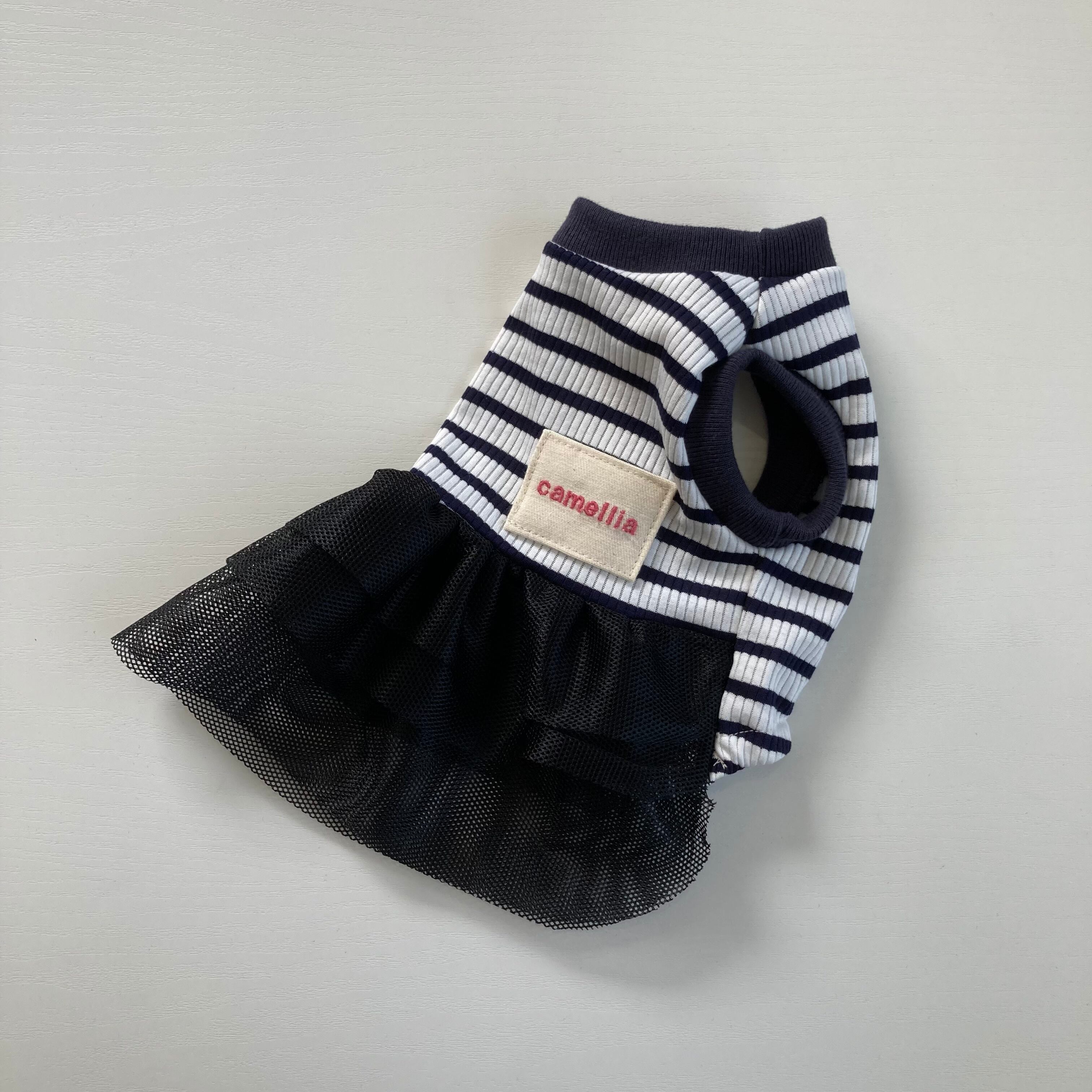 犬服 ワンピース ボーダー&チュール黒 XXSサイズ