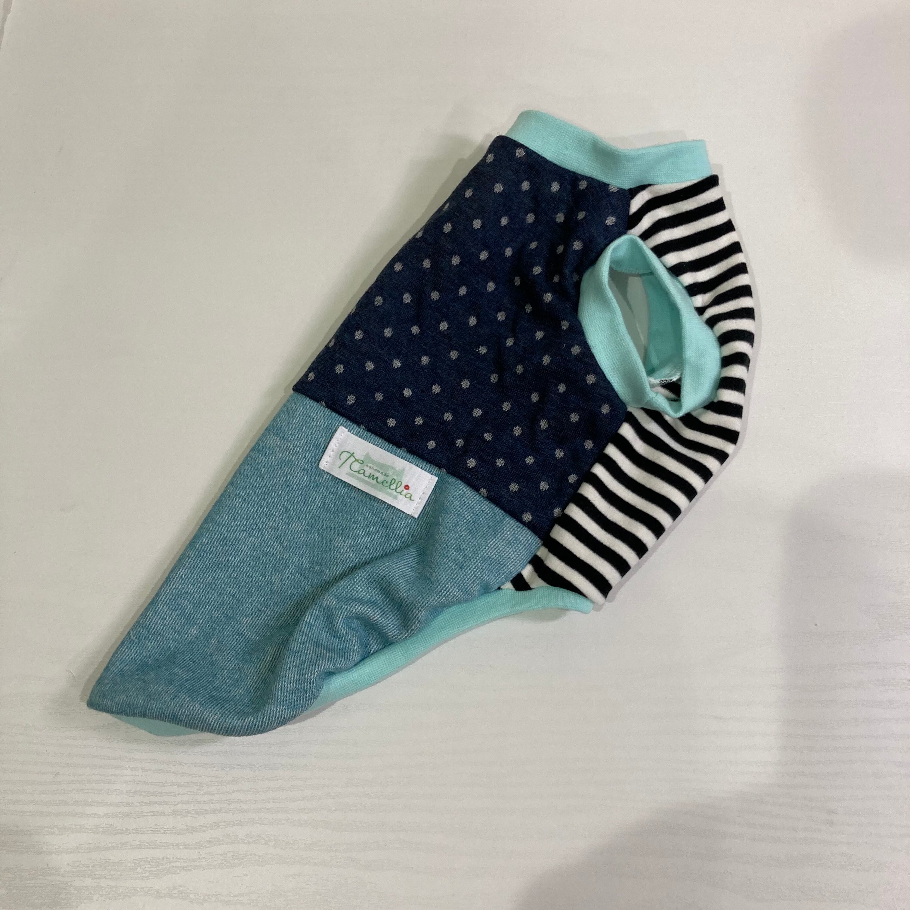 犬服 切り替えタンクトップ 紺ドット&ブルー ロング丈Sサイズ リブミント