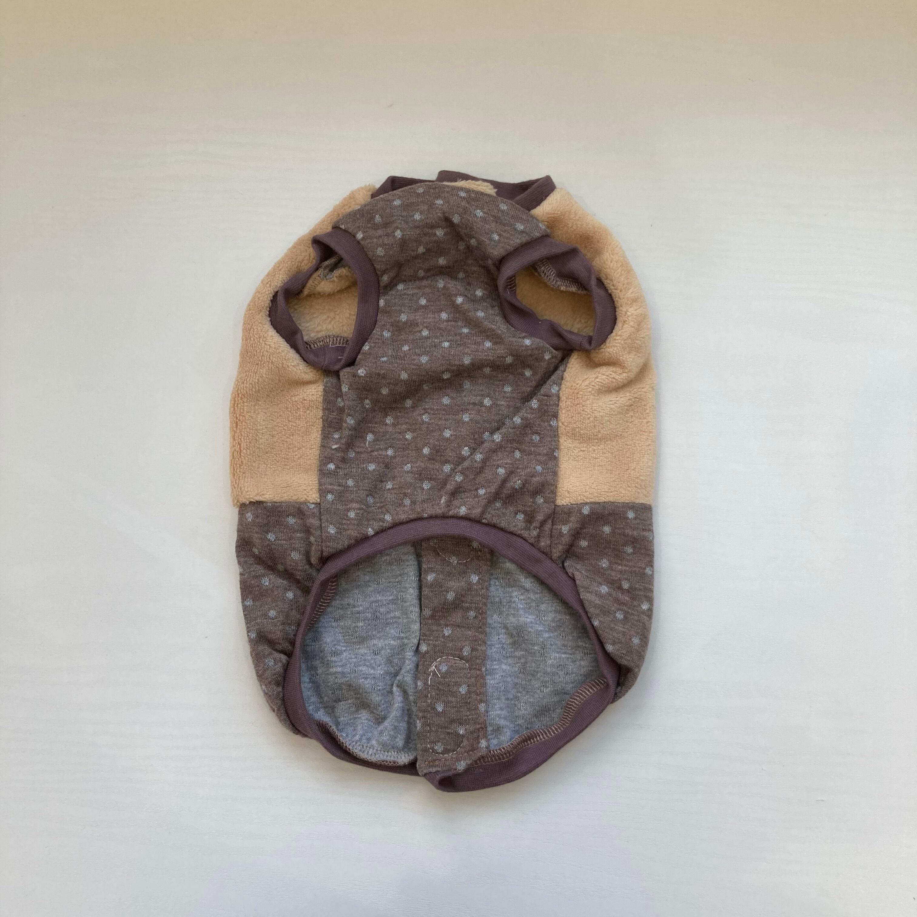 小型犬用 背開きタイプ Sサイズのフリース切り替えベスト ベージュ&茶ドット柄になります。