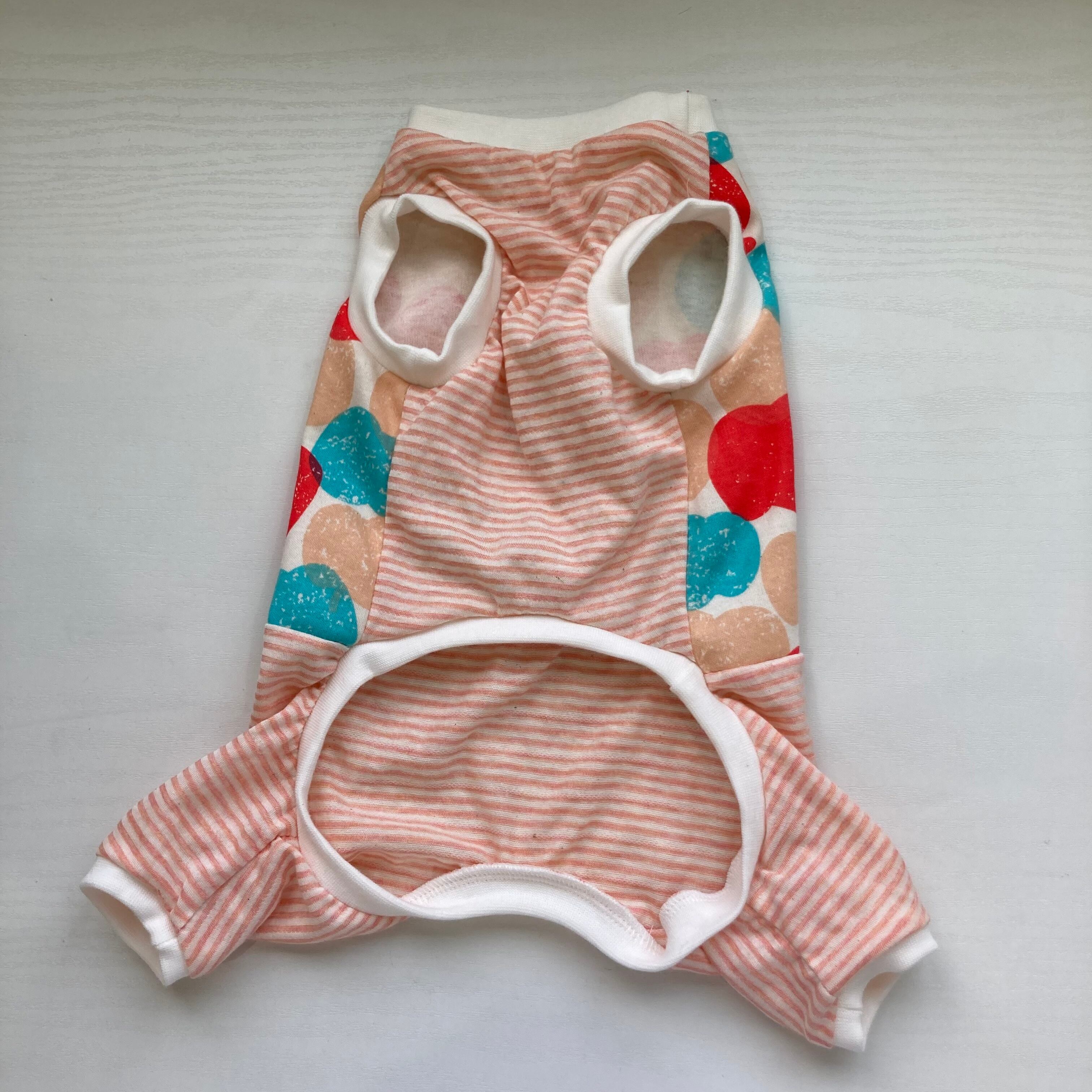 小型犬用Sサイズ ロンパース ツートンタイプ りんご柄&ピンクボーダーになります。