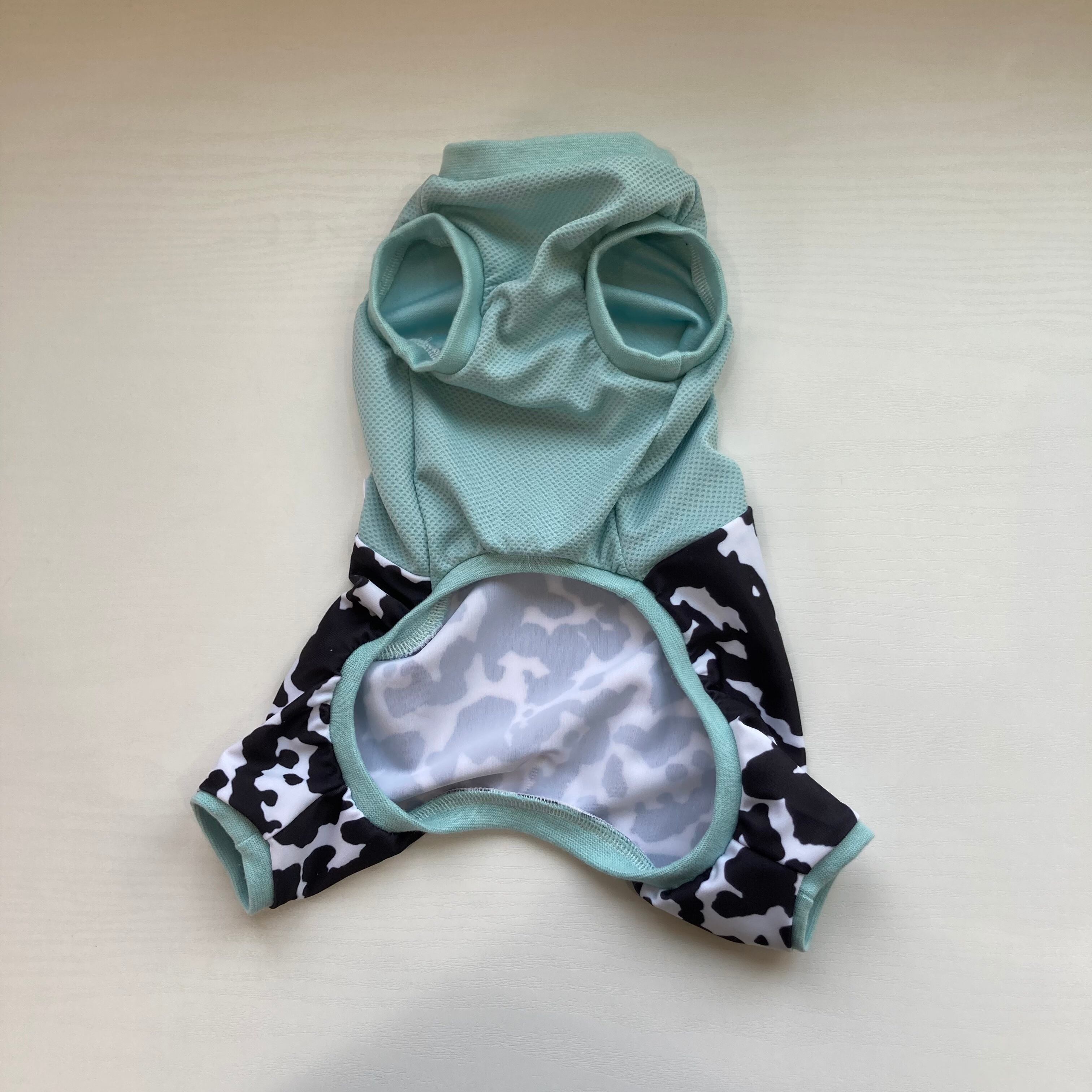 ロング小型犬用Mサイズ 接触冷感 ロンパース ツートンタイプ ブルー&牛柄になります。