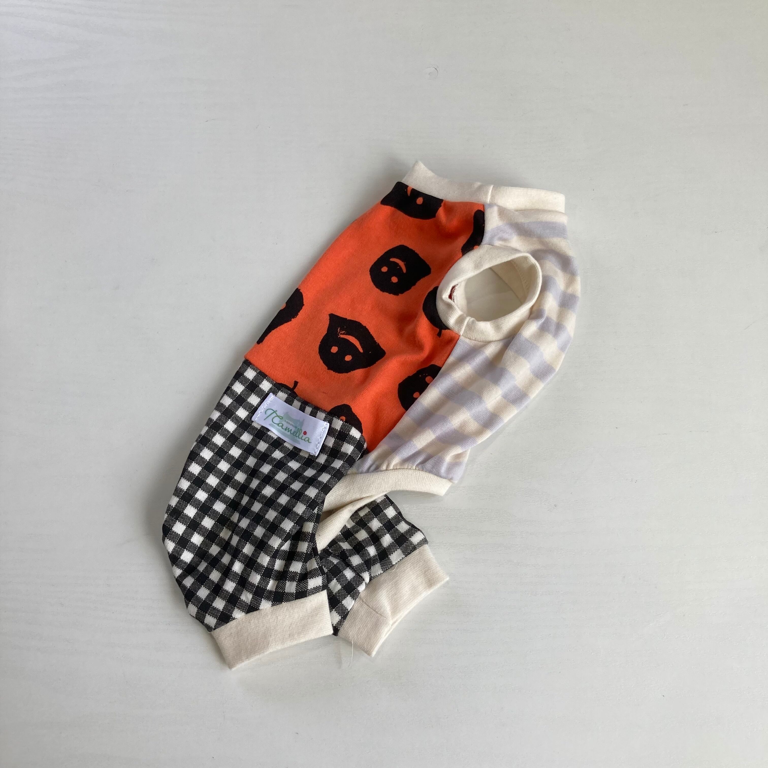 ハロウィン✨ 犬服 ロンパース ツートンタイプ ハロウィンオバケ柄(オレンジ)&チェック(ブラック)XSサイズ ハロウィン