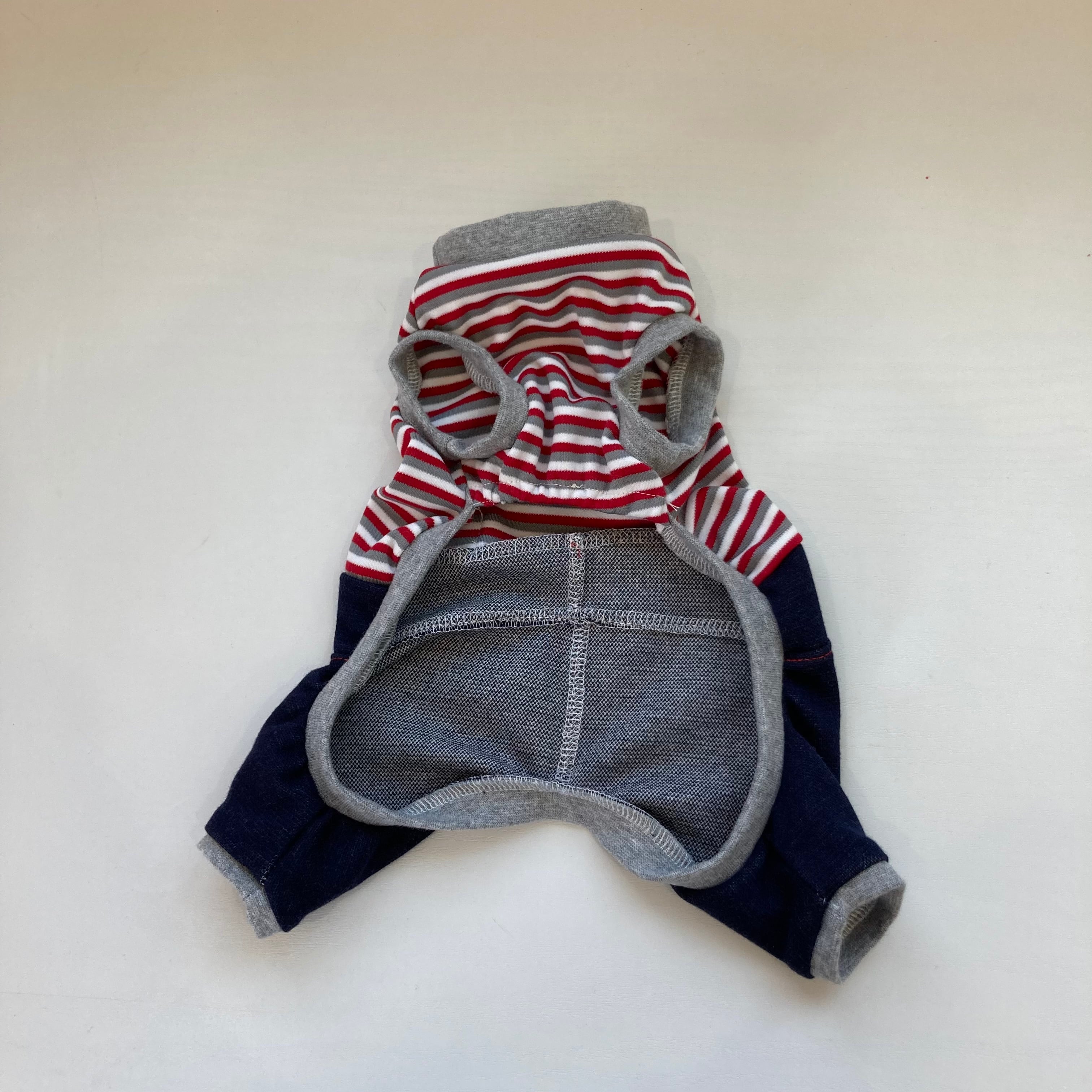 犬服 前丈短め ツートンロンパース ボーダー柄赤&デニム(グレーリブ) ステッチ入り XSサイズ