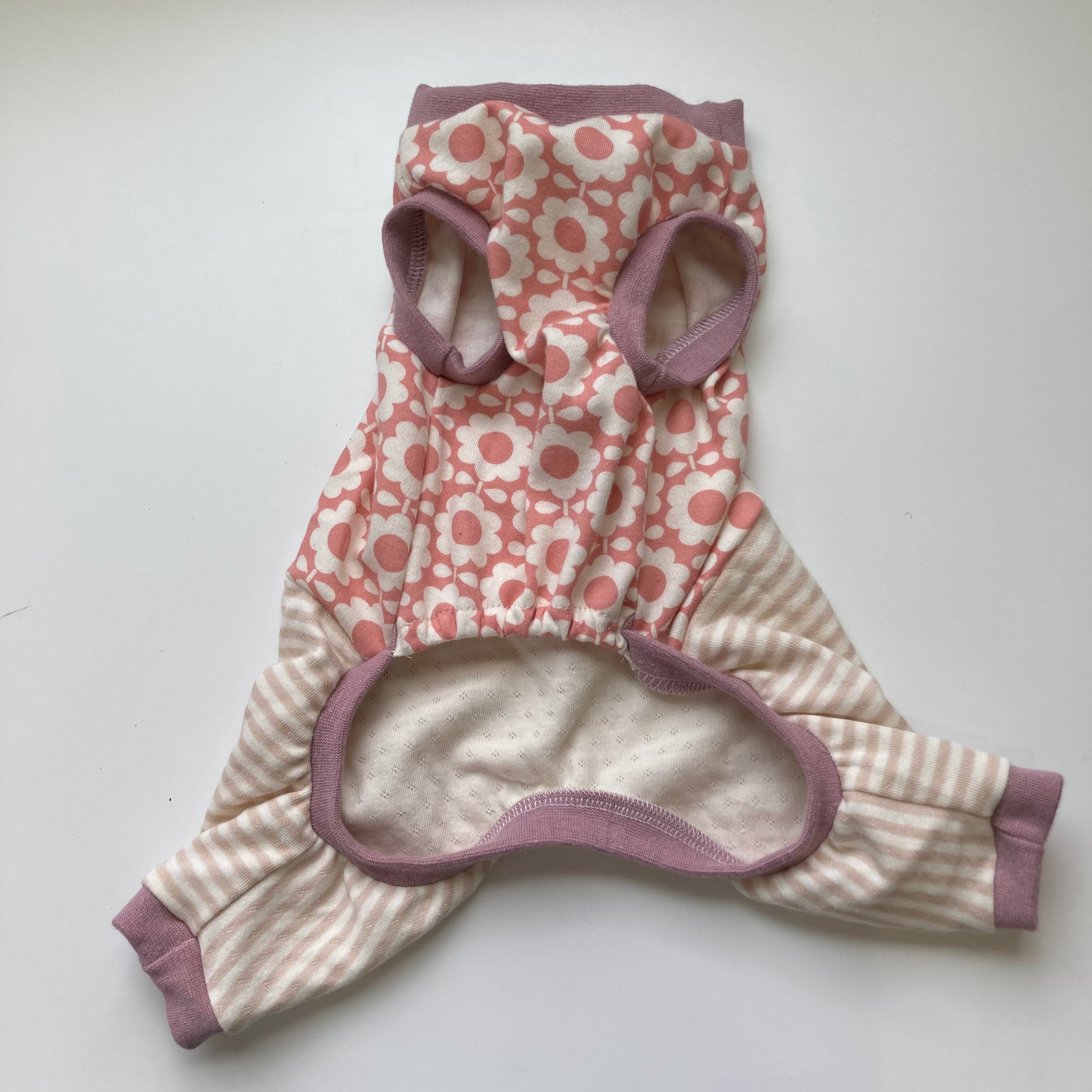 犬服 ツートンロンパース 北欧風花柄&ボーダーベージュ(くすみピンクリブ) Sサイズ