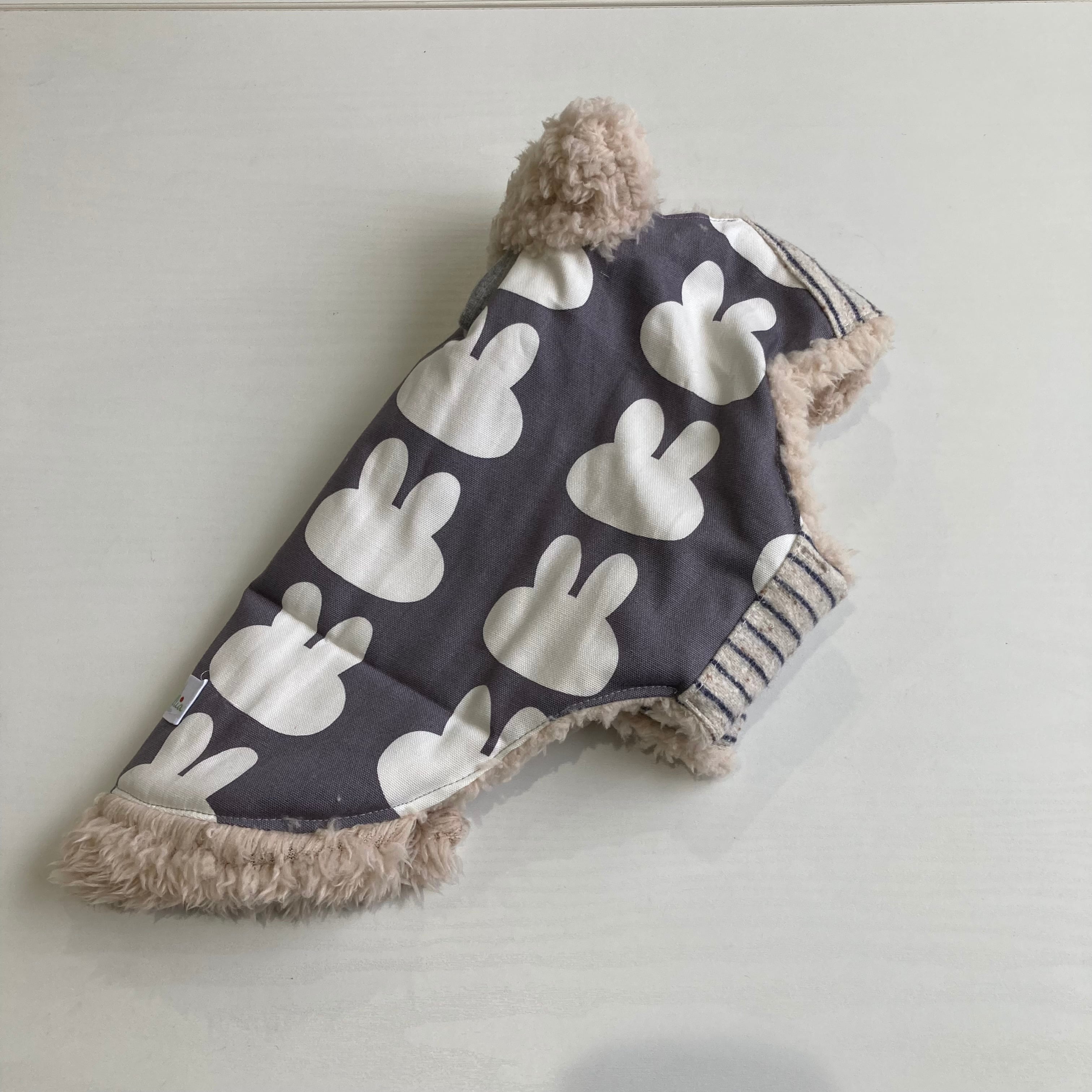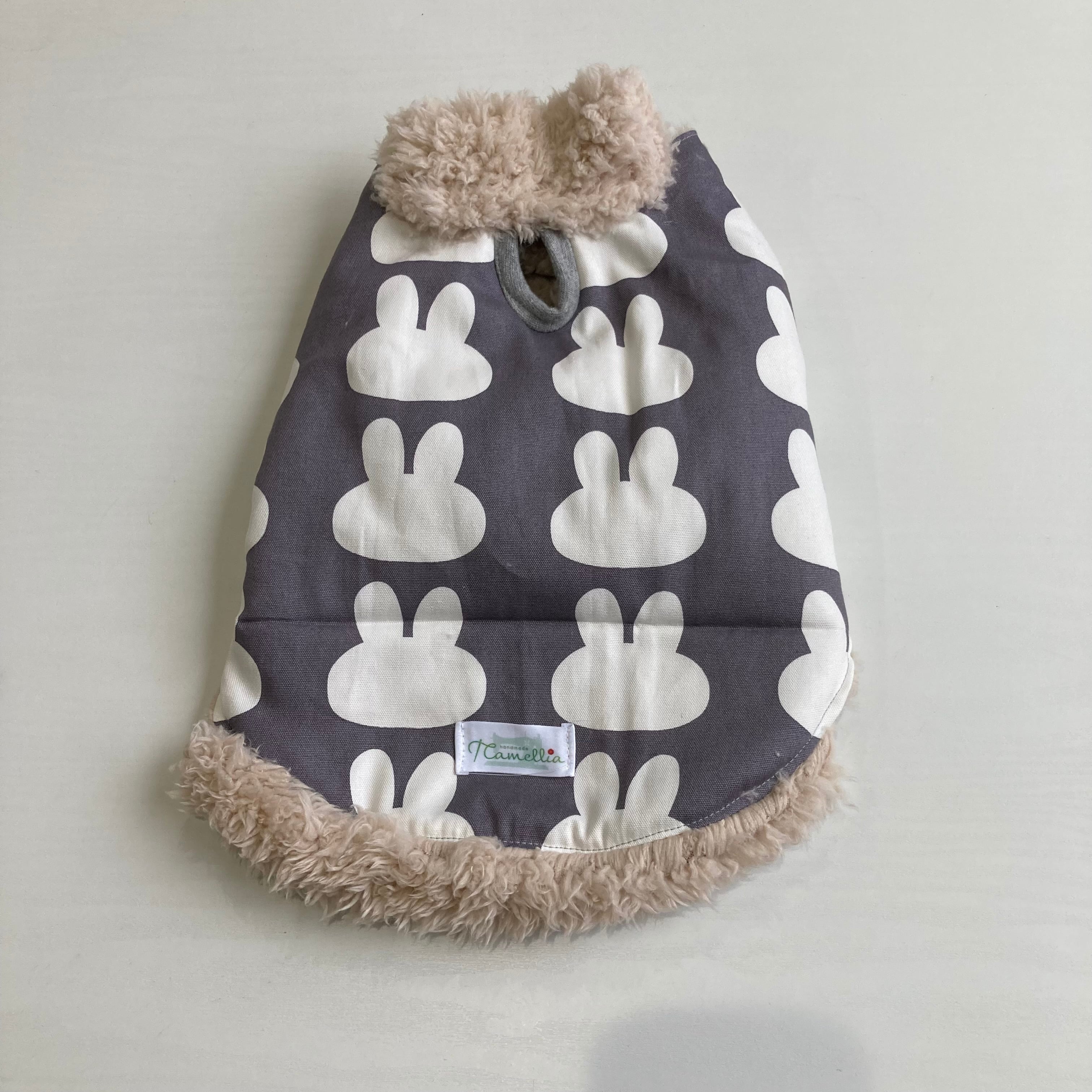 犬服 ポンチョ うさぎ柄(グレー)&プードルファー Mサイズ リード穴あり