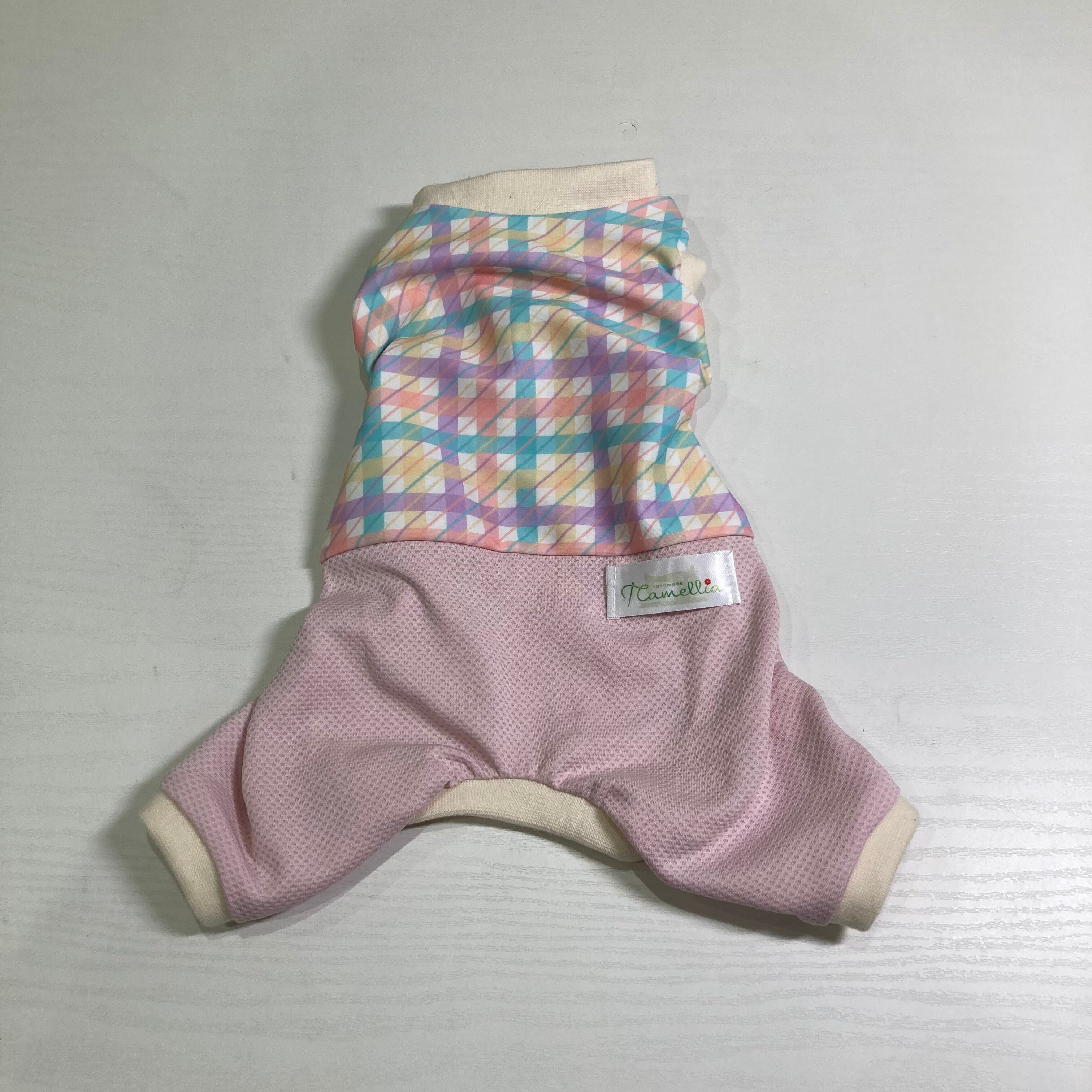 犬服 接触冷感 お腹側着丈短め ロンパース ツートンタイプ チェック(パステル)&ピンク(生成リブ)XSサイズ