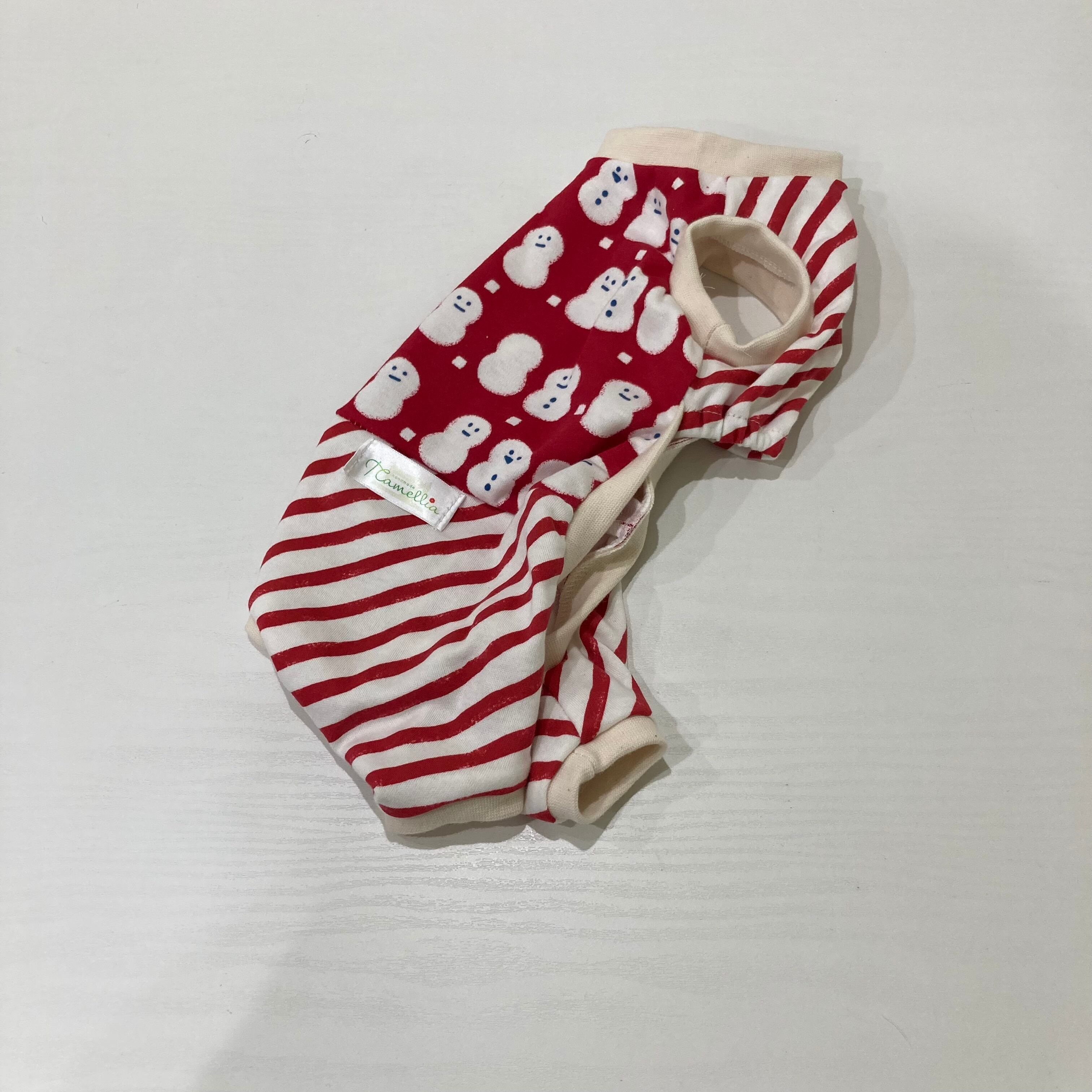 小型犬 ツートンロンパース 雪だるま(赤)&斜めボーダー柄(赤白)生成リブ Sサイズ