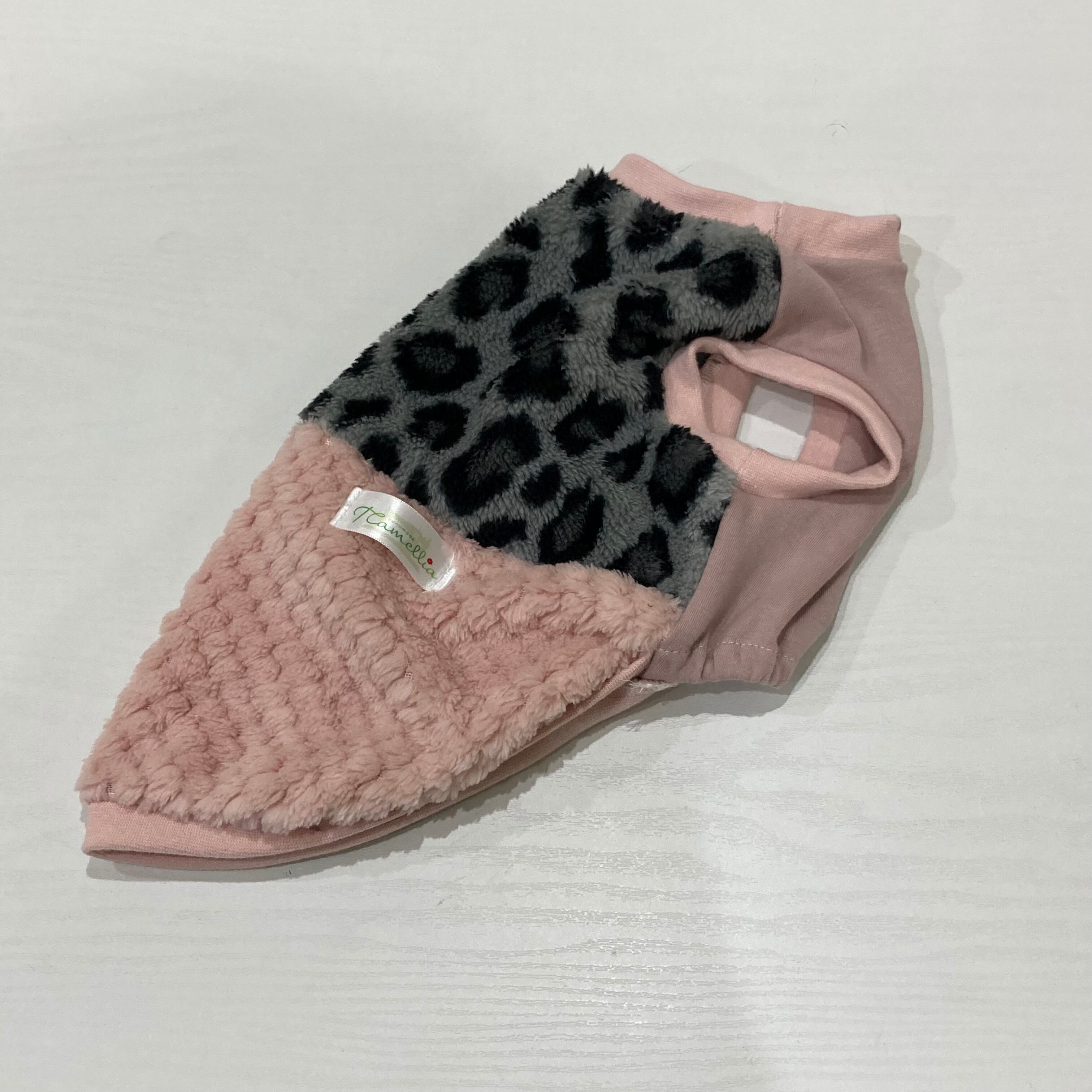 犬服 パイナップルボアツートンベスト いちごミルク&レオパード(グレー)ピンクリブ Sサイズ ふわふわベスト 女の子 男の子になります。