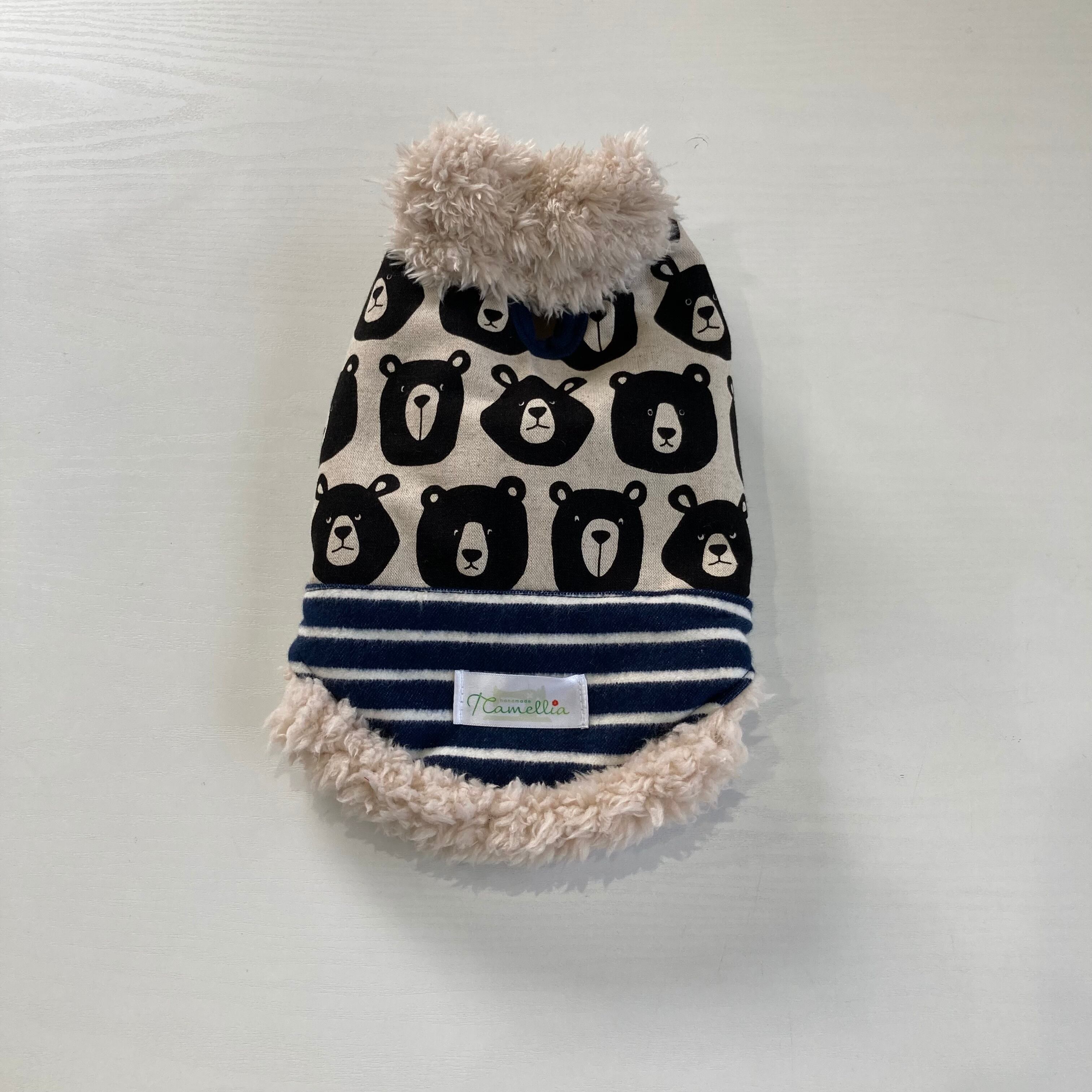 犬服 ポンチョ クマ柄(生成)&ボーダー(紺)プードルファー XXSサイズ リード穴あり